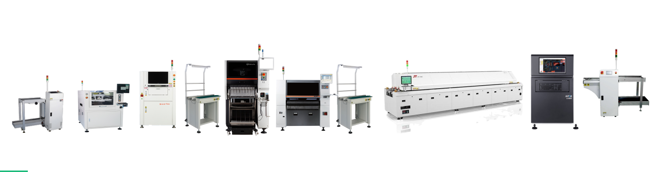 全自動(dòng)上板機(jī)→ 全自動(dòng)印刷機(jī)GKG  GSE→思泰克SPI →接駁臺(tái) →HM520→ SM482 plus→ 接駁臺(tái)→ 勁拓回流焊→ 矩子在線AOI → 下板機(jī)(從左→ 右)