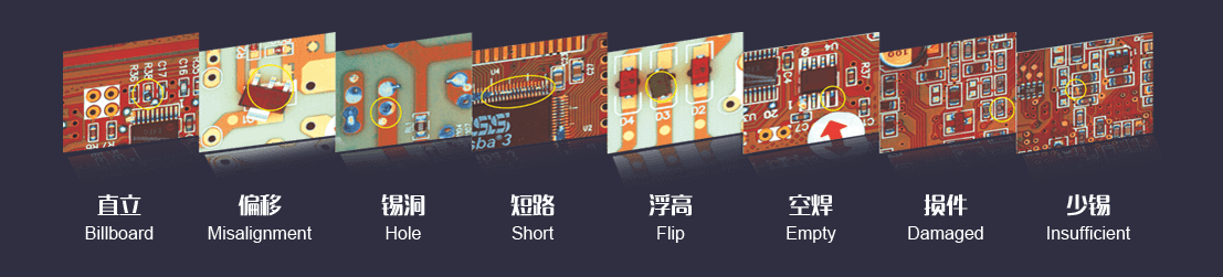 | 檢測覆蓋類型 | 偏移、少錫、短路、污染、缺件、歪斜、立碑、側(cè)立、翻件、錯件、破損、浮高、極性、虛焊、 空焊、溢膠、錫洞、引腳未出等 |